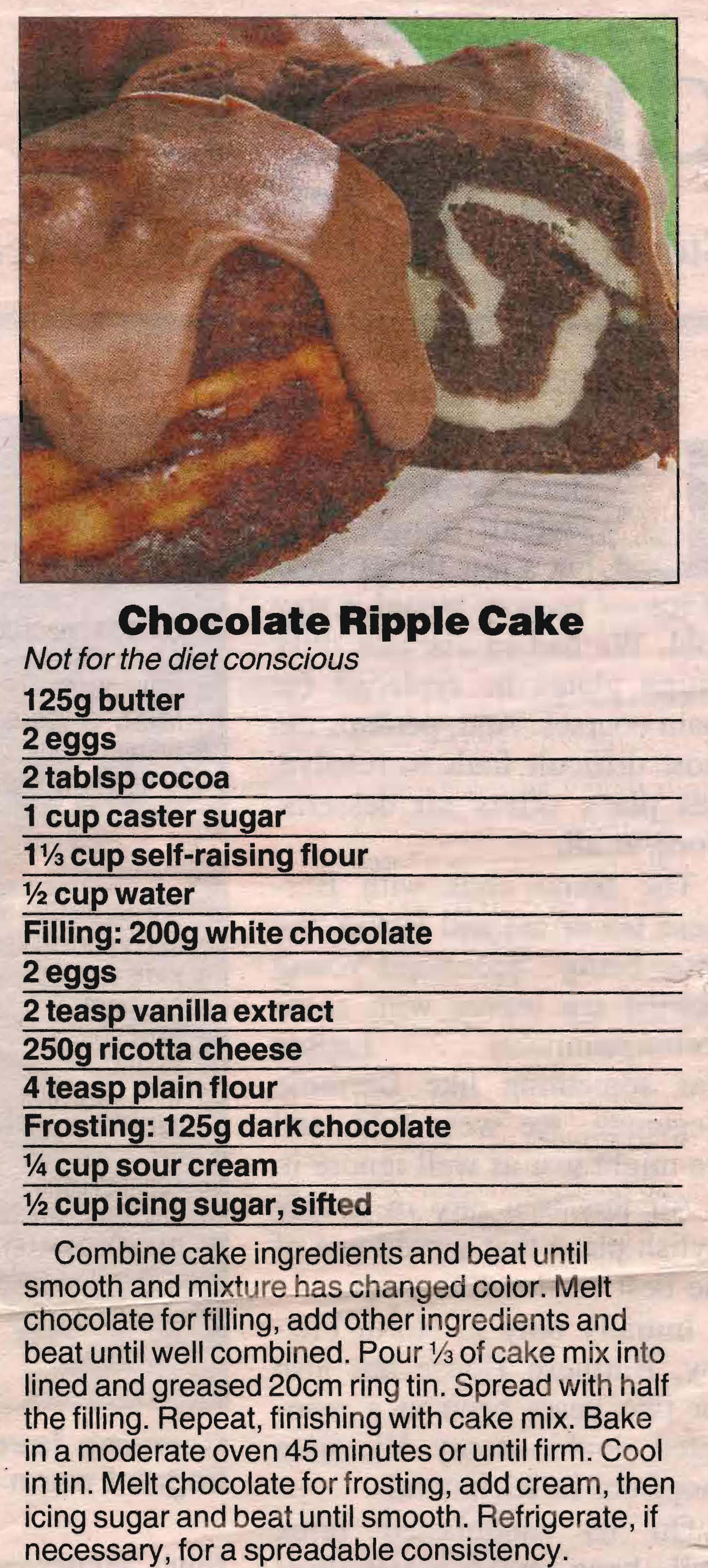 The name Chocolate Ripple Cake always conjures up the 1960s dessert of chocolate ripple biscuits sandwiched together with cream to my and others of my generations minds. But this recipe is actual a cake. A cake with a white chocolate filling and dark chocolate icing. Absolutely not for the diet conscious…………………