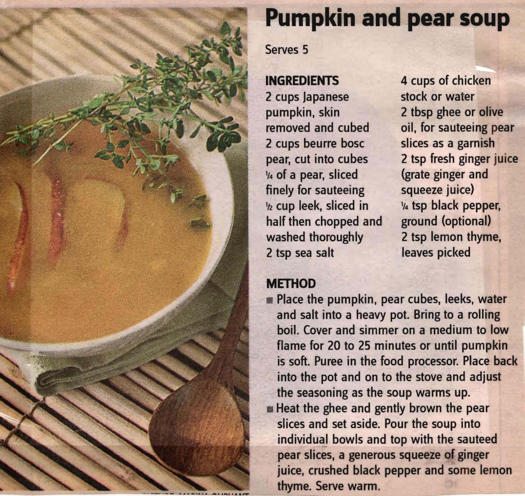 The first time I made this soup I had my doubts as to whether it would work or not, especially as neither my husband nor I like sweet food. But work it does. The sweetness of the pears blends really well with the pumpkin and while it’s not an everyday soup, it is a great dinner party starter.