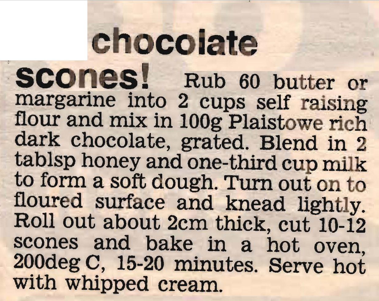 CHOCOLATE SCONES Posted on August 31, 2021 by bebsrecipes Time for afternoon tea? What about throwing together a batch of these chocolate scones, brewing a pot of coffee and enjoying a break……in these challenging times, you deserve it. Share this: Click to share on X (Opens in new window) X Click to share on Facebook (Opens in new window) Facebook Like Loading... Related
