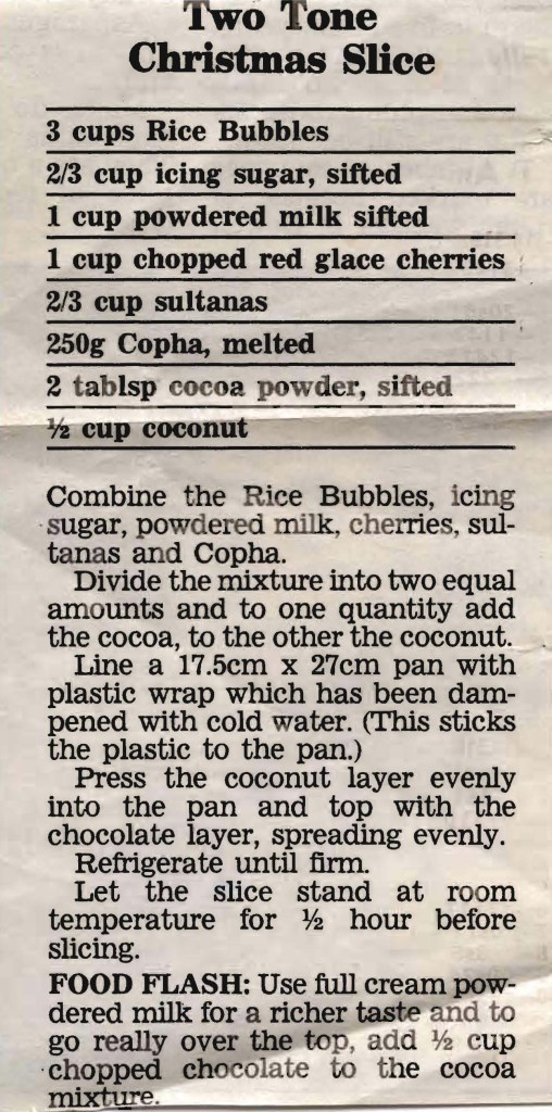 This is basically a White Christmas recipe, but to give it a bit more of a Christmassy look red glace cherries and a chocolate layer have been added to the rice bubbles and copha. Back in the 80s copha was used in a lot of unbaked slices and while it’s not used as much these days the classic White Christmas something Mum made every year and was a family favourite.