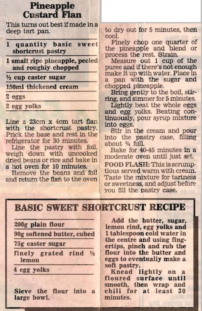 I think the secret of a good flan is the pastry, so I’ve included the Basic Sweet Shortcrust Recipe that was published along with this flan in the Sun newspaper. It’s a lot easier to buy a prepared base, but I think it’s worth the effort to make your own. Filled with the creamy pineapple filling and served with cream or ice cream you end up with a great dessert.