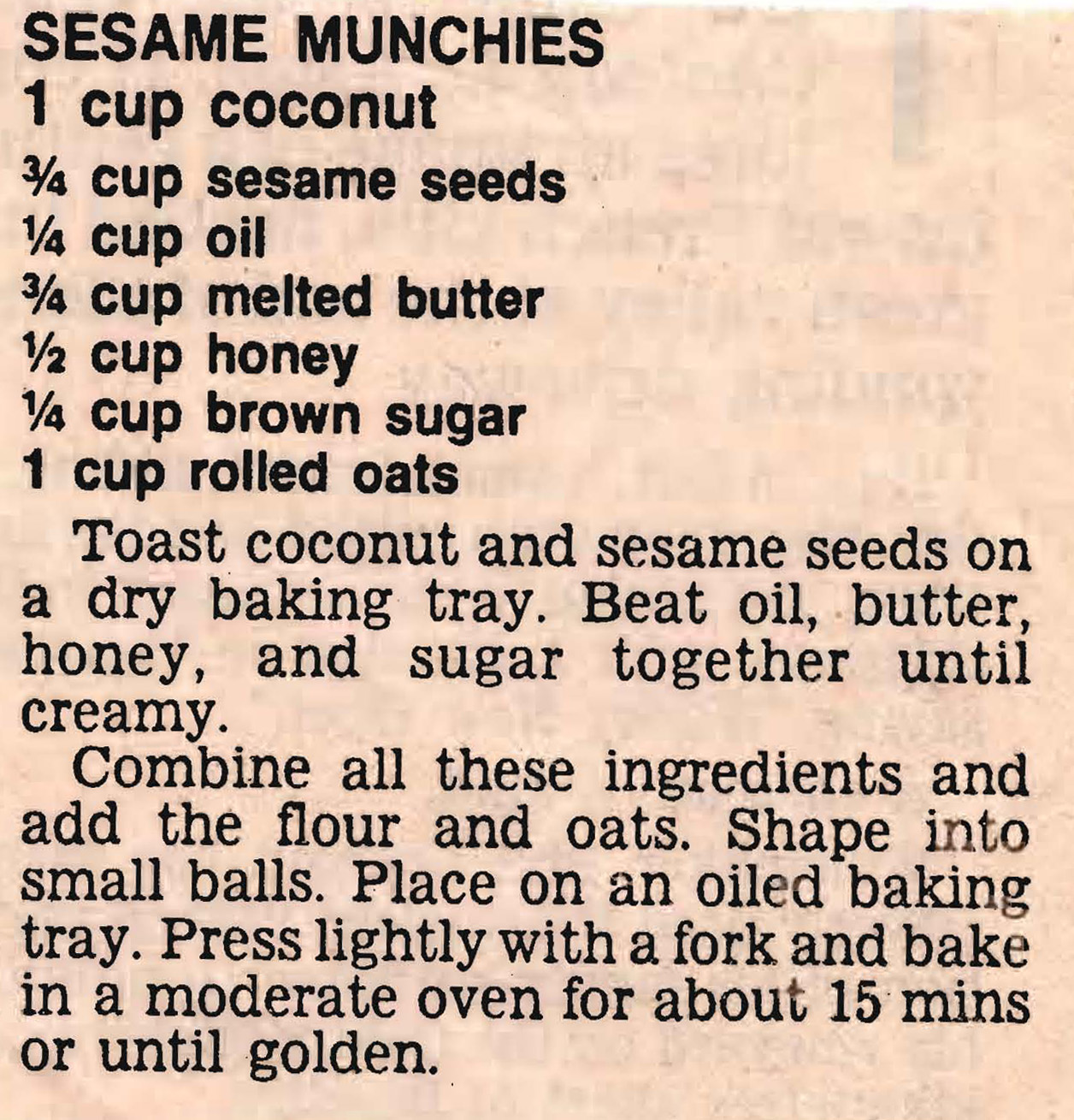 SESAME MUNCHIES Posted on February 27, 2022 by bebsrecipes I always think of sesame biscuits as being savory, but these are definitely sweet as they have honey and brown sugar, mixed in with coconut, rolled oats, oil and butter. Almost a healthy combination!!!! Share this: Click to share on X (Opens in new window) X Click to share on Facebook (Opens in new window) Facebook Like Loading... Related