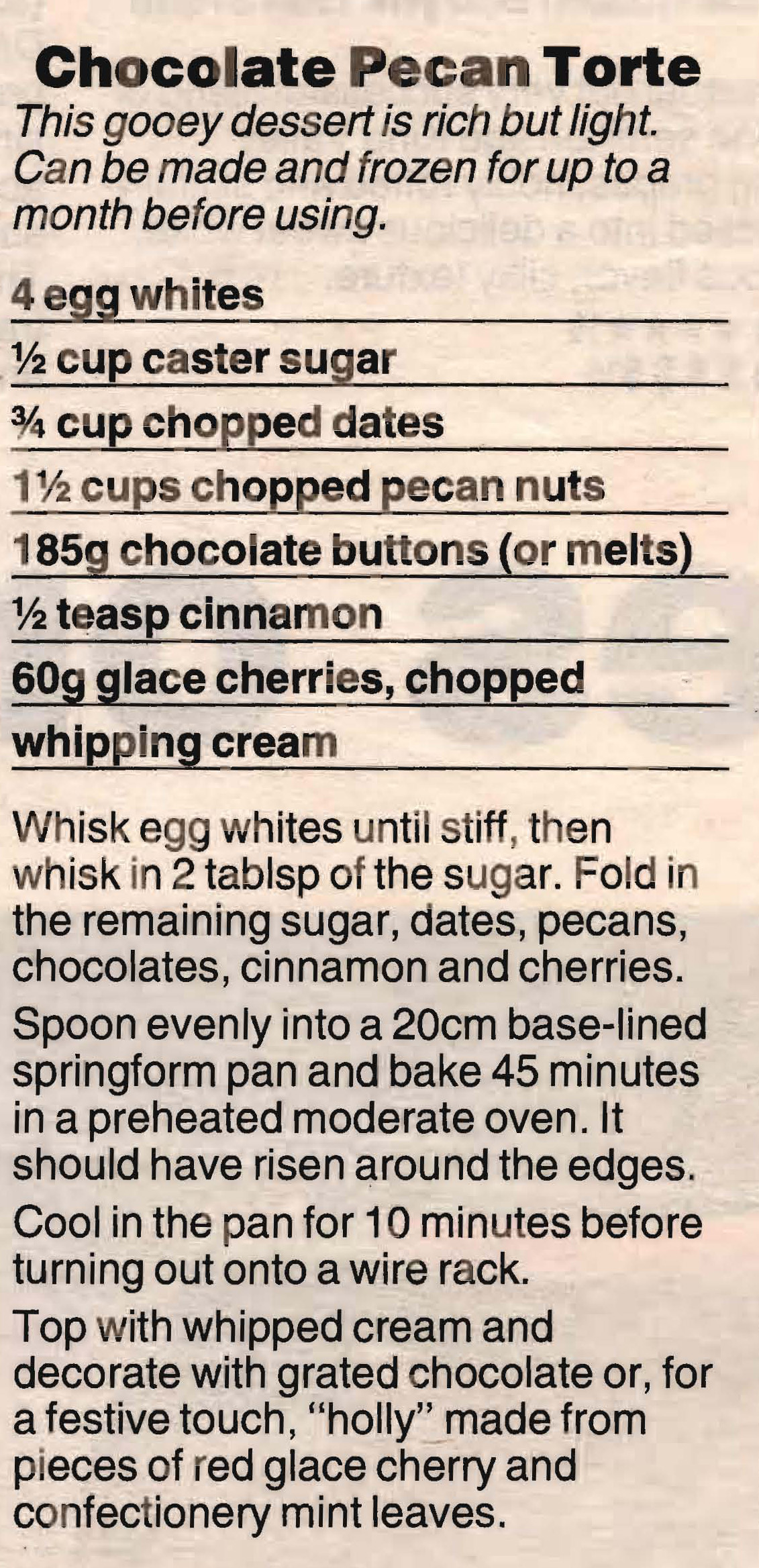CHOCOLATE PECAN TORTE Posted on April 6, 2022 by bebsrecipes I like the description that the Herald Sun writer gave this dessert “gooey, rich but light”. Not quite sure how accurate that is as I haven’t made it yet, but I’m sure my chocolate loving granddaughter would be a good person to try it out on. Share this: Click to share on X (Opens in new window) X Click to share on Facebook (Opens in new window) Facebook Like Loading... Related
