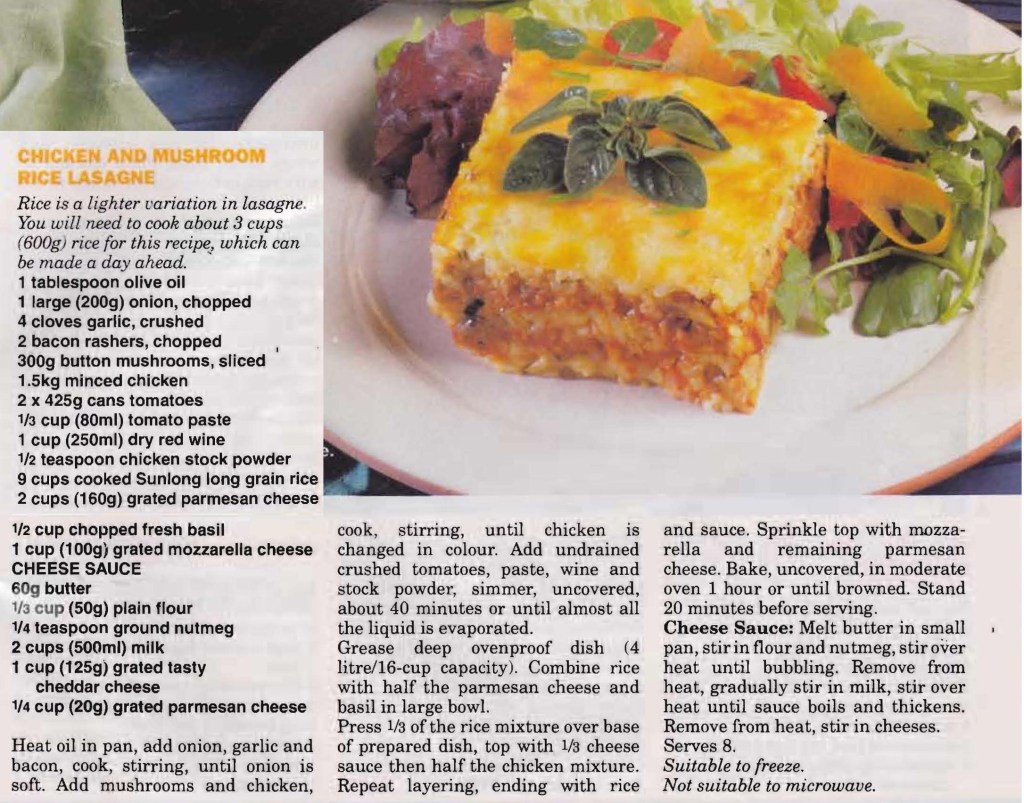 I haven’t tried this rice lasagne, although I have made a chicken lasagne both with standard lasagne sheets and with Gluten Free ones. My original recipe uses plain flour like this recipe, but I simply substituted GF plain flour which worked fine. To be totally honest I’m not sure how close to lasagne this rice one would turn out, maybe it would be more a rice slice. I think you’d have to careful you didn’t overcook the rice or it could be quite soggy. Even so it’s probably worth a try.
