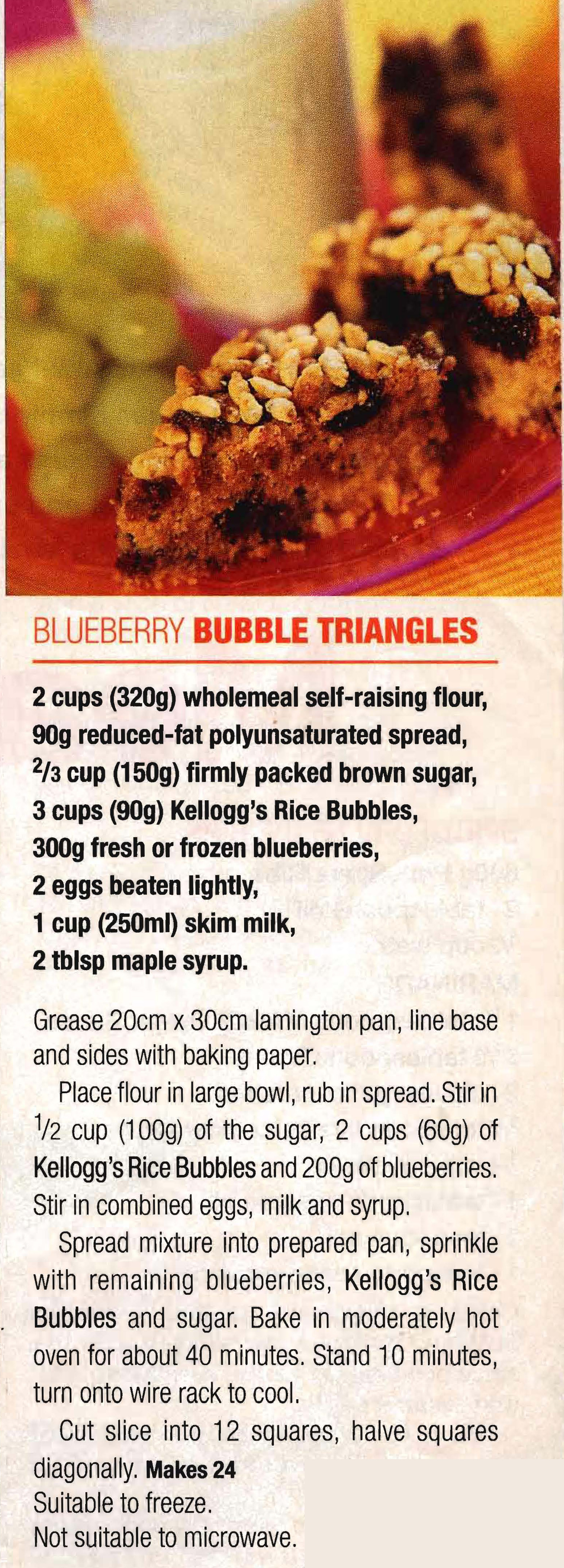 BLUEBERRY BUBBLE TRIANGLES Posted on July 31, 2022 by bebsrecipes The heading on this Kellogg’s Rice Bubble recipe is ‘back-to-school treat’ and it would definitely be great to add to a school lunch box, but I suspect a lot would be eaten before it made it that far. Share this: Click to share on X (Opens in new window) X Click to share on Facebook (Opens in new window) Facebook Like Loading... Related