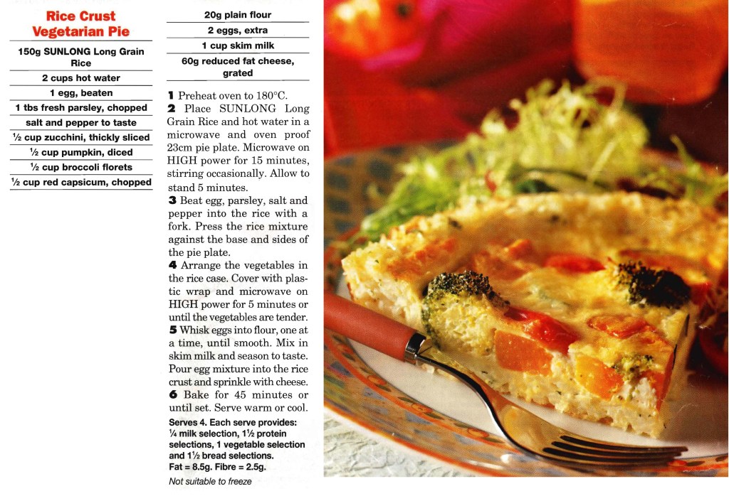If you substitute GF plain flour for ordinary plain flour in this recipe you have a pie that works equally well for Vegetarians and Gluten Free eaters. Finding a good pie base that is GF can be a bit of a challenge and while this has a vegetable filling there’s no reason why some bacon or chicken couldn’t be added. The rice crust makes a good alternative to a flour based crust.