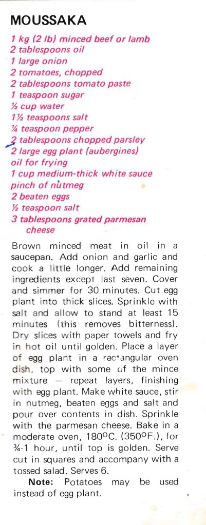 This recipe was in a little cookbook put out by the Australian Meat Board back in the 1970s and I’ve been making it since those days. So it’s certainly a very tried and tested recipe. I’ve made it with the traditional eggplant, but also with potatoes – both work and both taste great.
