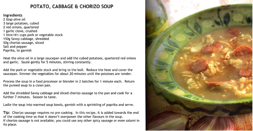 POTATO, CABBAGE AND CHORIZO SOUP Posted on August 12, 2023 by bebsrecipes It’s still winter here in Melbourne, so it’s not too late to make this very hearty soup. Share this: Click to share on X (Opens in new window) X Click to share on Facebook (Opens in new window) Facebook Like Loading... Related