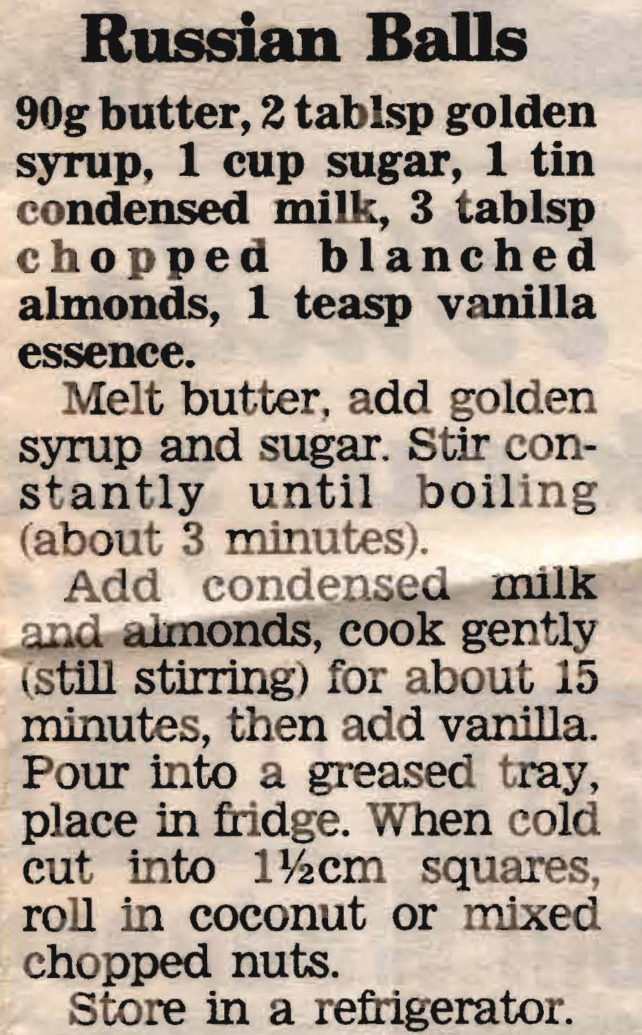 The ingredients in these Russian Balls sound quite yummy, but I am a bit perplexed by the name. The recipe says to cut them into squares before you roll them in coconut or mixed chopped nuts, surely that would make them Russian Squares!! Mind you I don’t think it matters in the least, balls or squares, they’ll taste great either way.