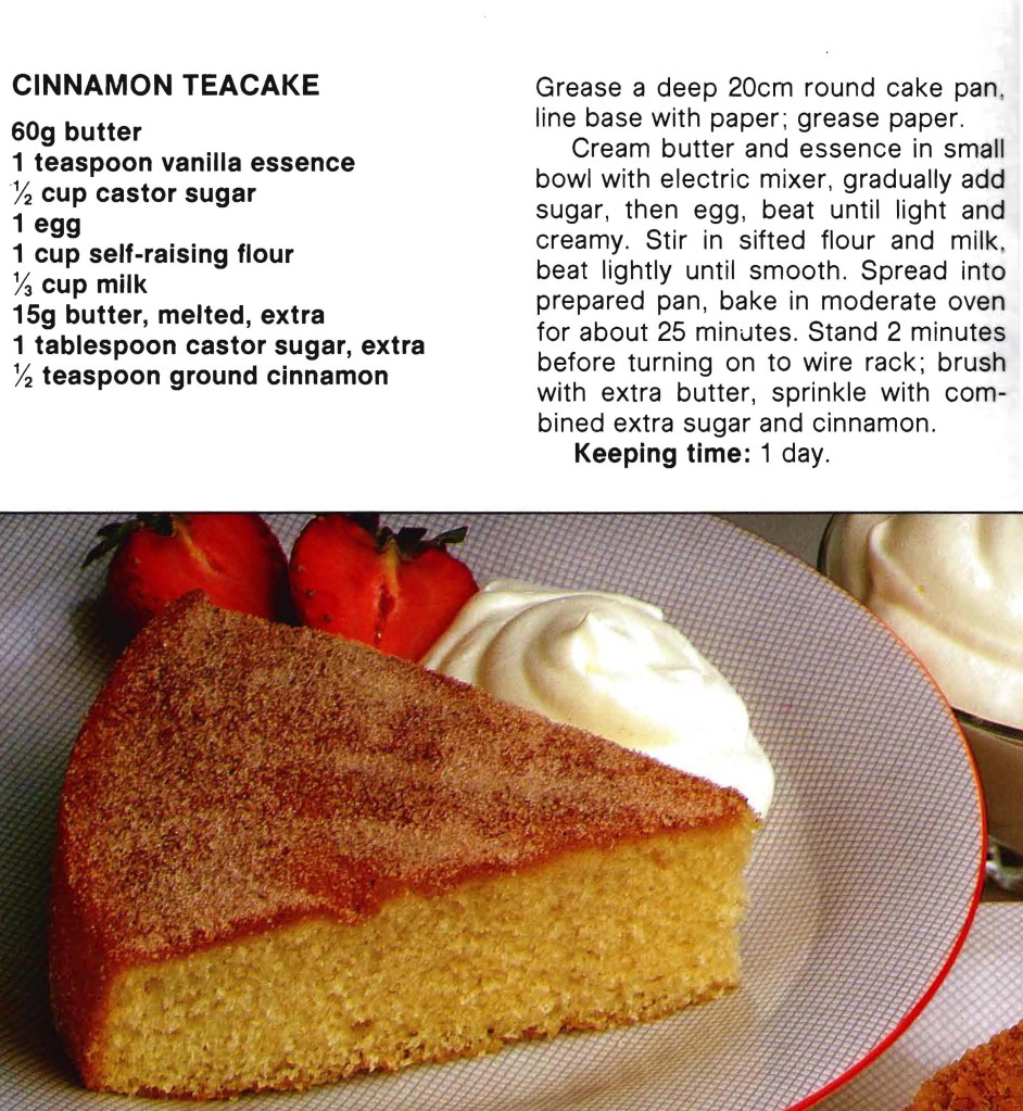 CINNAMON TEACAKE Posted on January 22, 2024 by bebsrecipes Teacakes are a wonderfully easy cake to make and are great for visitors, especially served with strawberries and cream. The only disadvantage of them is that they don’t keep, so make sure you eat lots on the day you bake it. Share this: Click to share on X (Opens in new window) X Click to share on Facebook (Opens in new window) Facebook Like Loading... Related