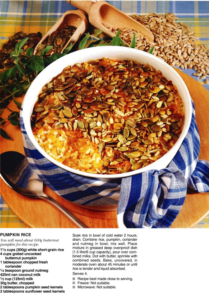 PUMPKIN RICE Posted on March 31, 2024 by bebsrecipes Pumpkin isn’t a favourite vegetable in our house, but I might try this recipe. I think the added crunch of the pumpkin and sunflower seeds might just disguise the mashed pumpkin enough for me to get away with it. Share this: Click to share on X (Opens in new window) X Click to share on Facebook (Opens in new window) Facebook Like Loading... Related