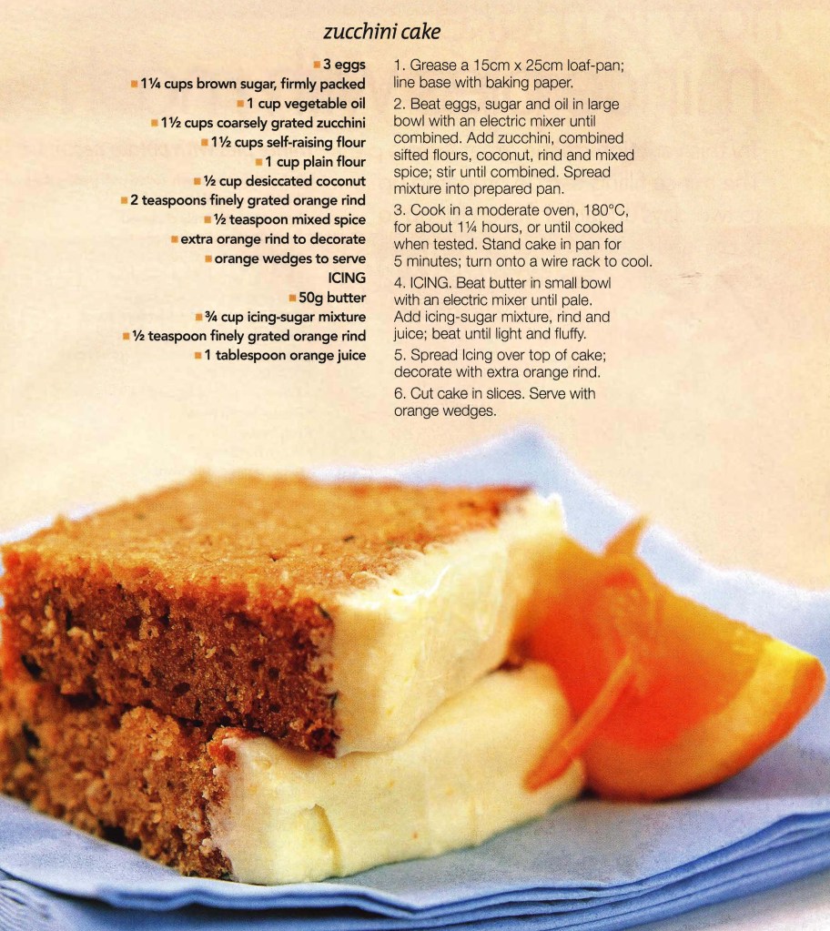It always surprises me just how versatile zucchini are. They’re a bit bland cooked on their own, but added to a stir fry, a stew, a slice, a pie and even a cake they’re a little gem. This cake recipe combines them with coconut and orange and is topped with a luscious orange icing – you can’t call that bland.