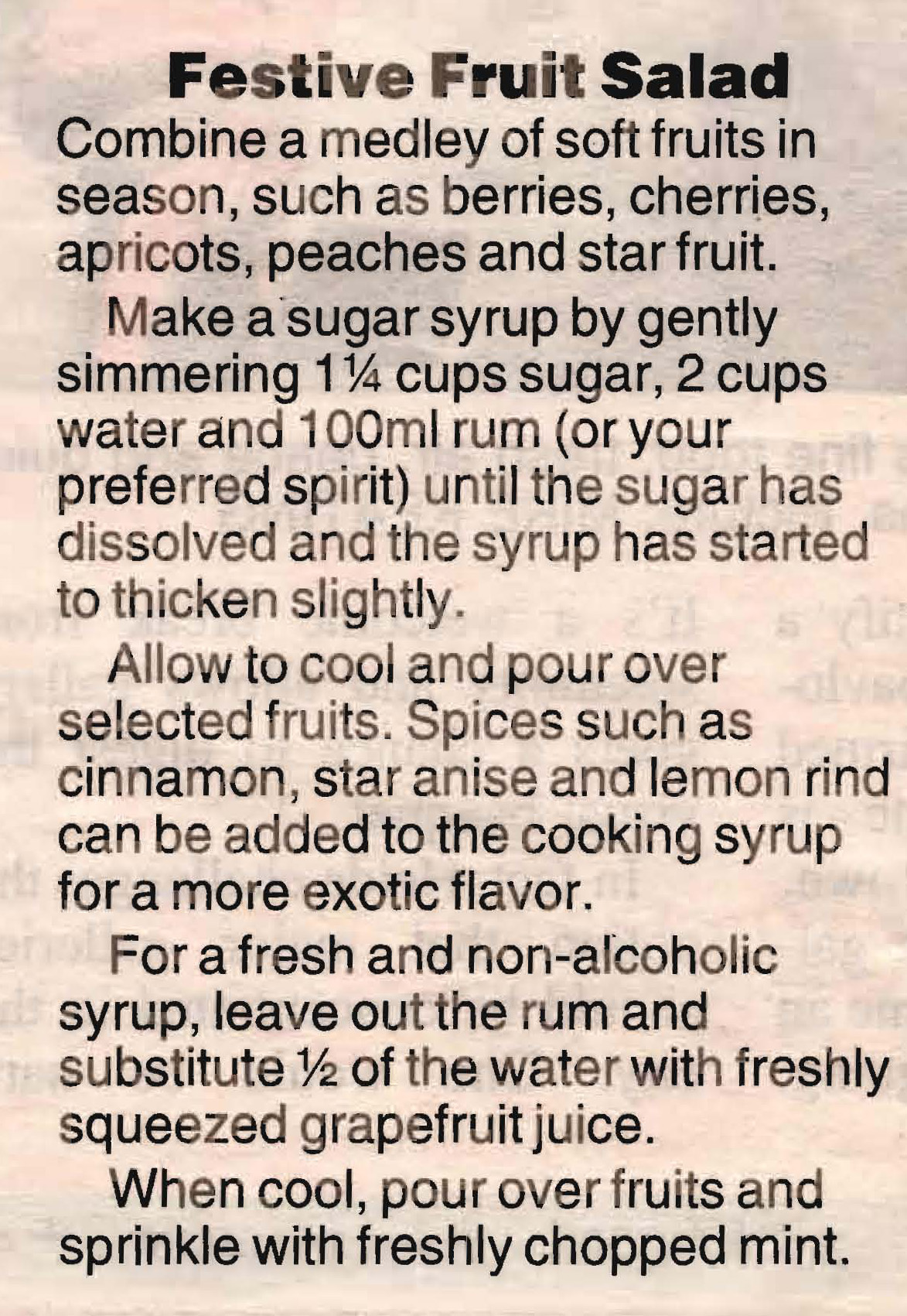If your family groans at the idea of heavy plum pudding after a large Christmas lunch, this might work for you. It’s easy to prepare, you can use any fruit that you like, you can make it alcoholic or non-alcoholic and prepare it in advance. Served with ice cream, custard or cream it’s a great alternative.
