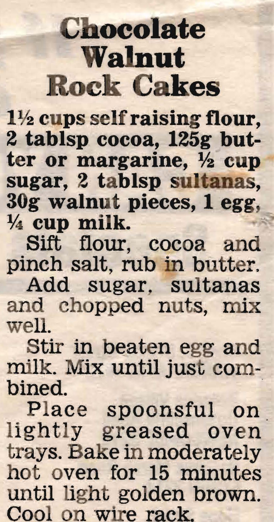 I’m not exactly sure when this recipe was published in the Herald Sun. You can see by the condition of the print that it is quite old and of course the ingredients being in Imperial measurements is the other giveaway. Cinnamon Scrolls are usually made with a yeast dough and that seems like a lot of trouble and a long wait to me. This recipe is a lot easier and quicker and that has to be a pretty big plus.