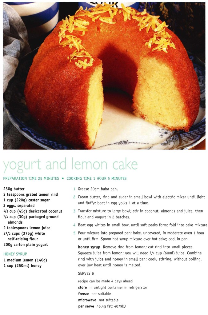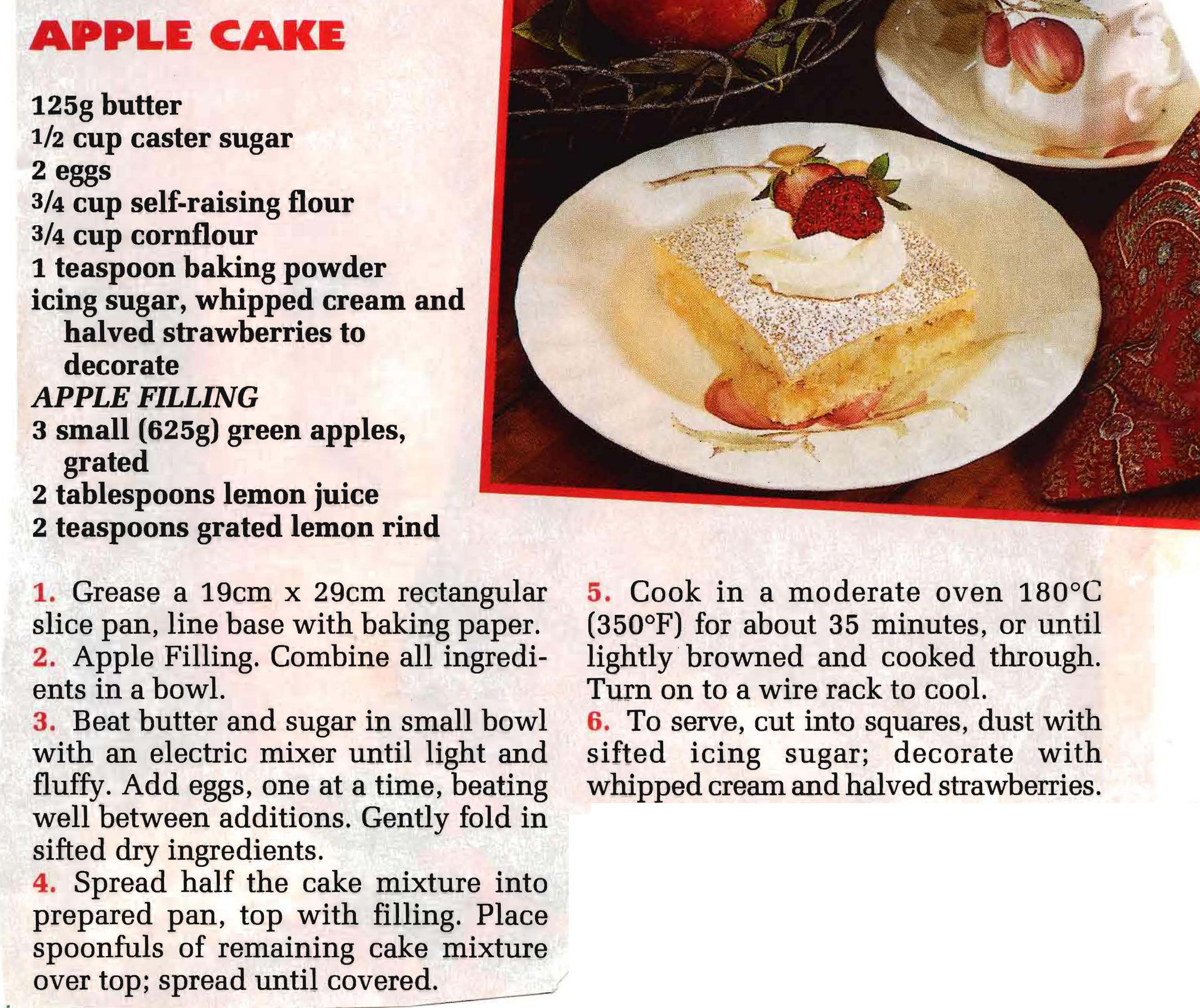 The unusual thing about this apple cake is that instead of using stewed apples for the filling, the apples are grated and simply layered on top of the cake mixture. The picture seems to suggest having it with tea or coffee, but I think it would work just as well as a yummy dessert.