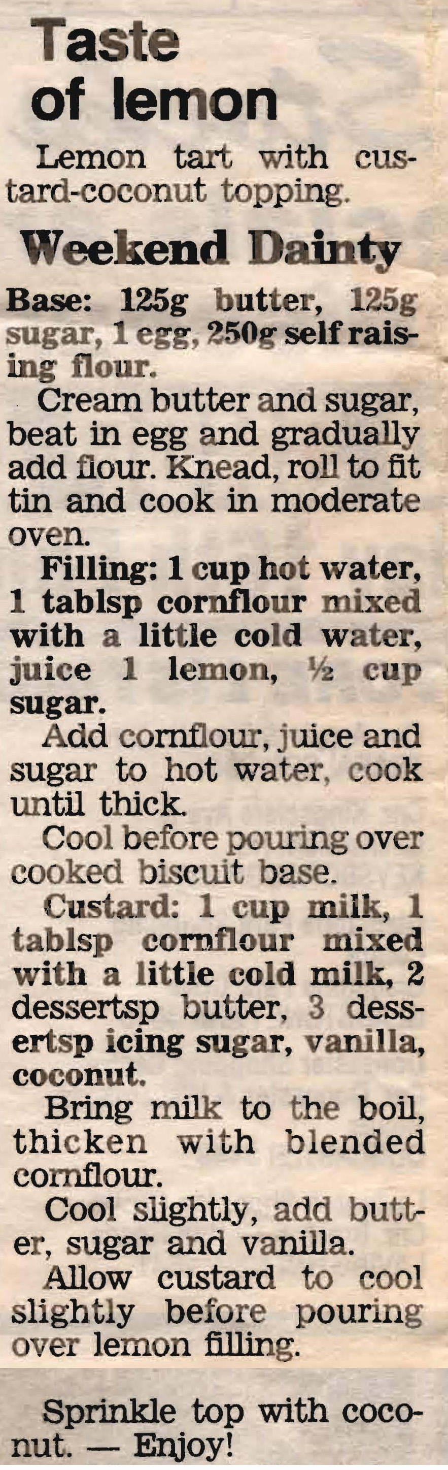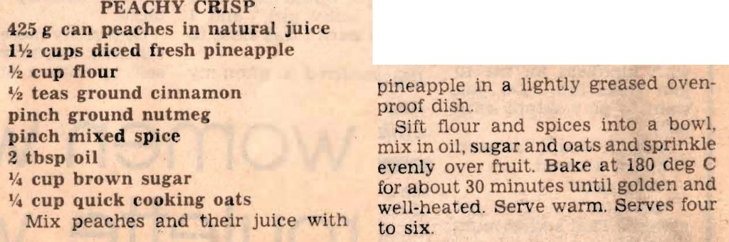 There’s lots of different fruit dishes with a crumble-type topping, but I think this one is slightly different with its combination of tinned peaches and fresh pineapple. If you have the luxury of lots of fresh peaches you could use poached ones instead of tinned, that would definitely make it even better.