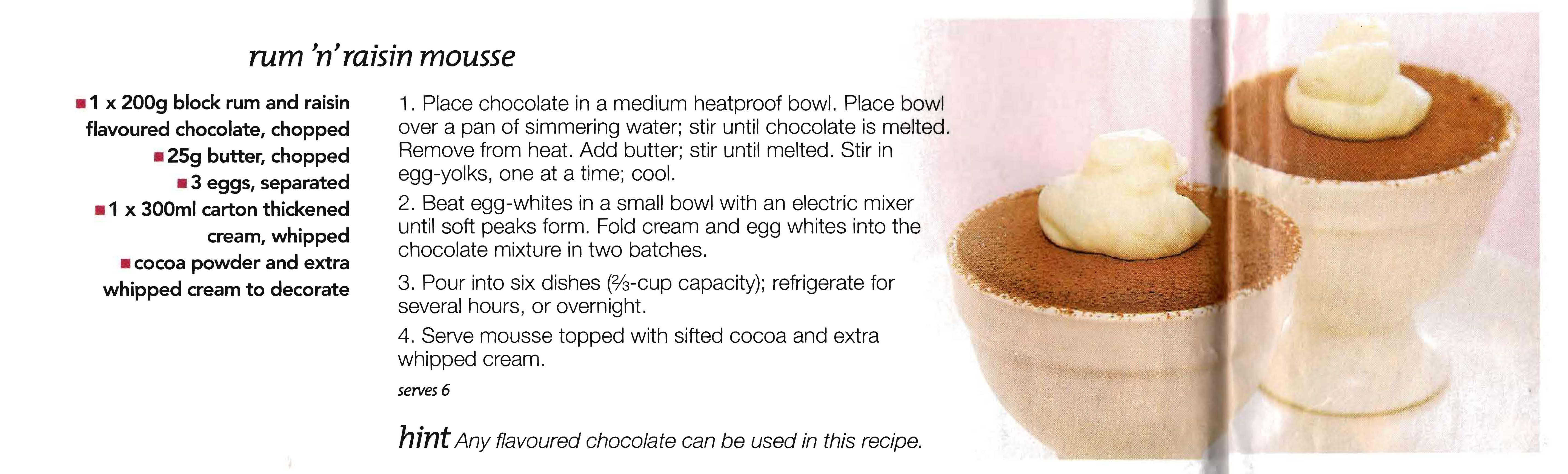 I often make chocolate mousse using Toblerone chocolate, so I really like the idea of using a block of rum and raisin chocolate to make this recipe. Unlike the Toblerone version this one has a little melted butter in it, but otherwise it’s pretty much the same and as long as you check the chocolate, it’s gluten free.