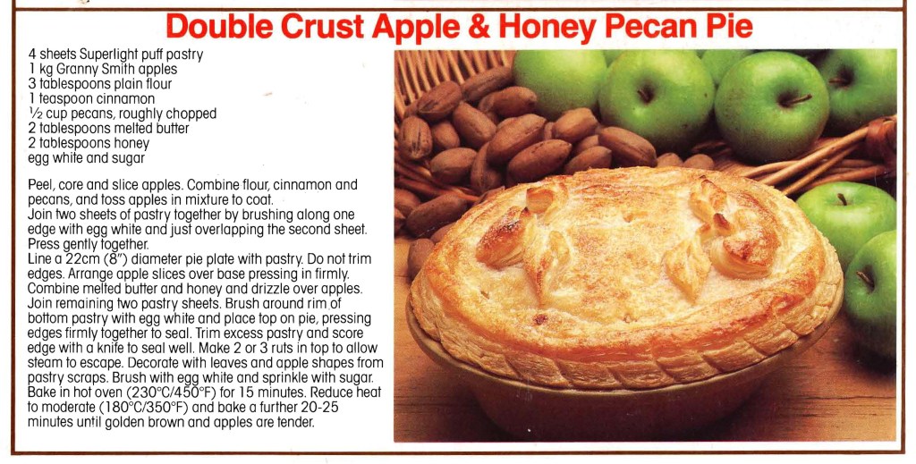 This recipe comes from the back of a pack of Puff Pastry sheets. Of course you can make your own pastry, but really who has time for that, especially when the bought product is so good. Which leaves the biggest job to be the peeling, coring and slicing of the apples. Definitely worth the effort if you end up with a great pie like the one in the picture.