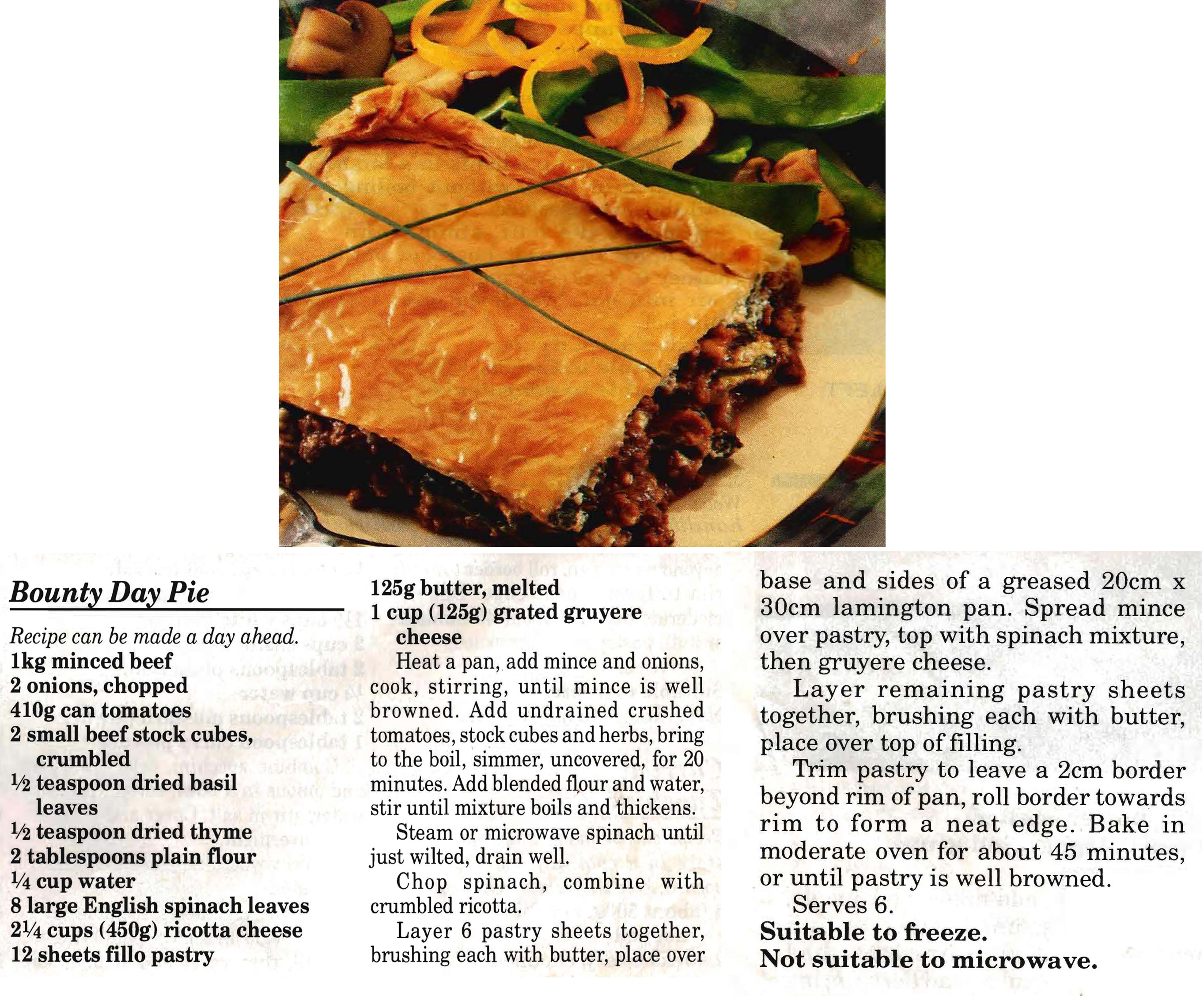 This another recipe from the Kraft Vegemite booklet. The vegemite is used in the sauce and not in the filling, which means you can add as much or as little as you like. I have doubts myself about using tinned vegetable soup for the sauce and don’t see why you couldn’t use mushroom instead.