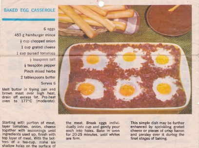 You can tell that this is a ’70s recipe by the picture. It doesn’t look particularly appetizing I’ll admit, but when you realize that it’s just a bolognese sauce with eggs on top it makes more sense. I’d definitely be sprinkling the grated cheese and bacon on top though as that might make it look a bit better.
