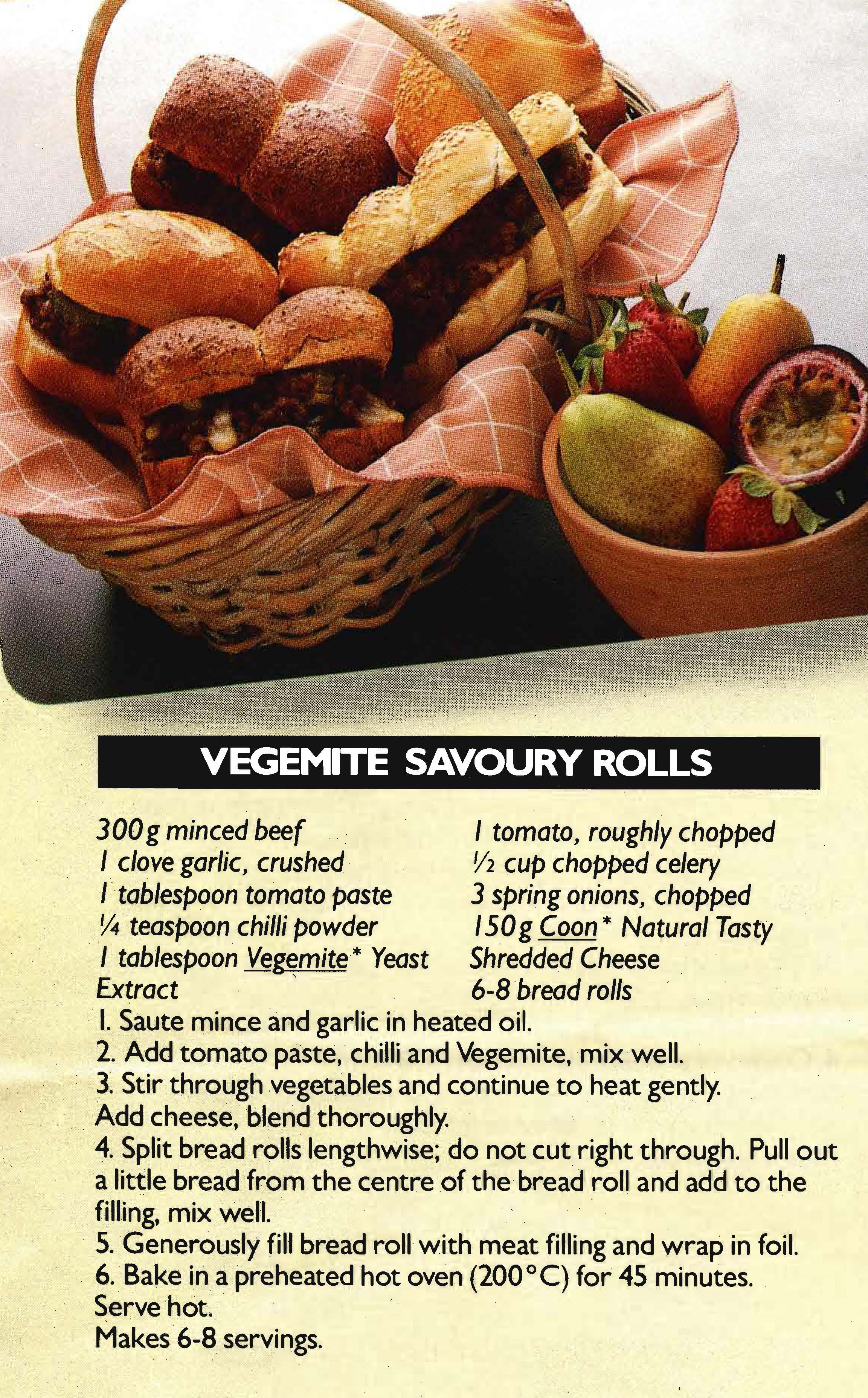 “The unique taste of Vegemite and how to get more out of every jar” is the opening sentence in this recipe booklet from Kraft. The world probably agrees with ‘unique’, but it’s definitely an Australian favourite. In this recipe it’s added into a cheesy hamburger mince mix and cooked in the oven in a bread roll, worth trying?