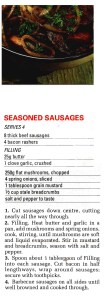 Cook sausages or meatballs. Fry onions in oil until softened, stir in mustard, tomato sauce, vinegar, worcestershire sauce, fruit sauce or chutney. Simmer 2-3 minutes. Mix cornflour with water, add till boiling and thickened, cover then add sausages or meatballs. Meatball recipe: minced steak, 1 tablespoon cooked rice, onion, curry powder.