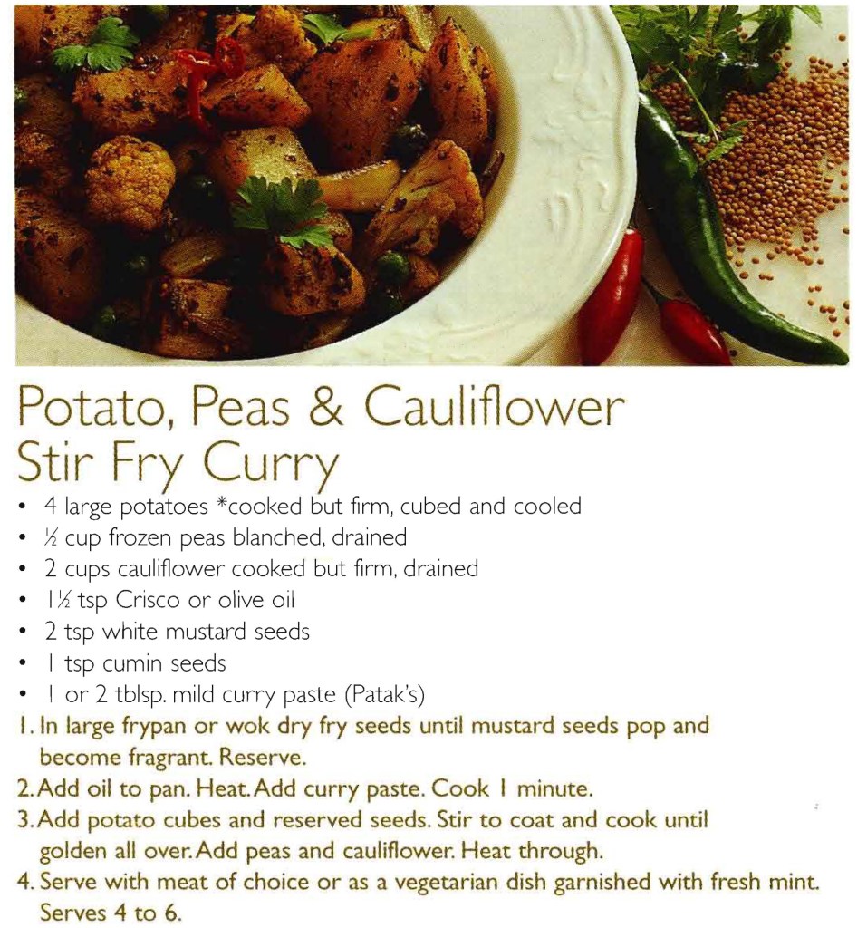 As Step 4 in this recipe says, this can be a vegetarian dish or a side dish served with whatever meat you wish. The potato and the cauliflower can be precooked in the microwave and once that’s done the rest is pretty quick and easy – and tasty.