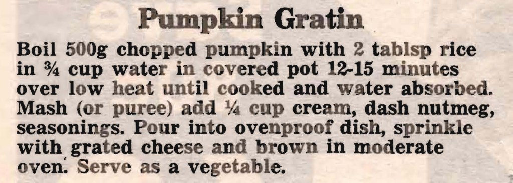Sick of boiled or roasted pumpkin and looking for another way to serve it? This is something different – pumpkin, rice, cream and seasonings, all topped with cheese and browned in the oven. Even the kids might like it.