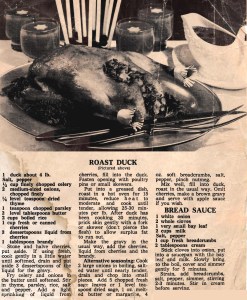 When I was young the Christmas treat was a roast chicken this could involve killing, plucking and cleaning the bird and was a major job. There was no such thing as frozen chicken so the effort in cooking a chicken made it very special. From chicken we seemed to have moved onto turkey for Christmas, but it’s not everyone’s favourite, especially the dried out leftovers. I found this old 1968 roast duck recipe in the collection and I thought it might be of interest. It has Bread Sauce to go with it, something I’ve never tried. So maybe it’s time for a change and return to the 1960s!!!