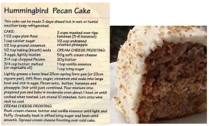 I’ve never made a Hummingbird cake and hadn’t heard of it until I found this recipe. Wikipedia tells me that the Hummingbird Cake was created on the island of Jamaica and was named after the island’s national bird and that it’s been a favourite of American county fairs and baking competitions since the 1970s. This one is made using pecans, but you can use walnuts, if you prefer.