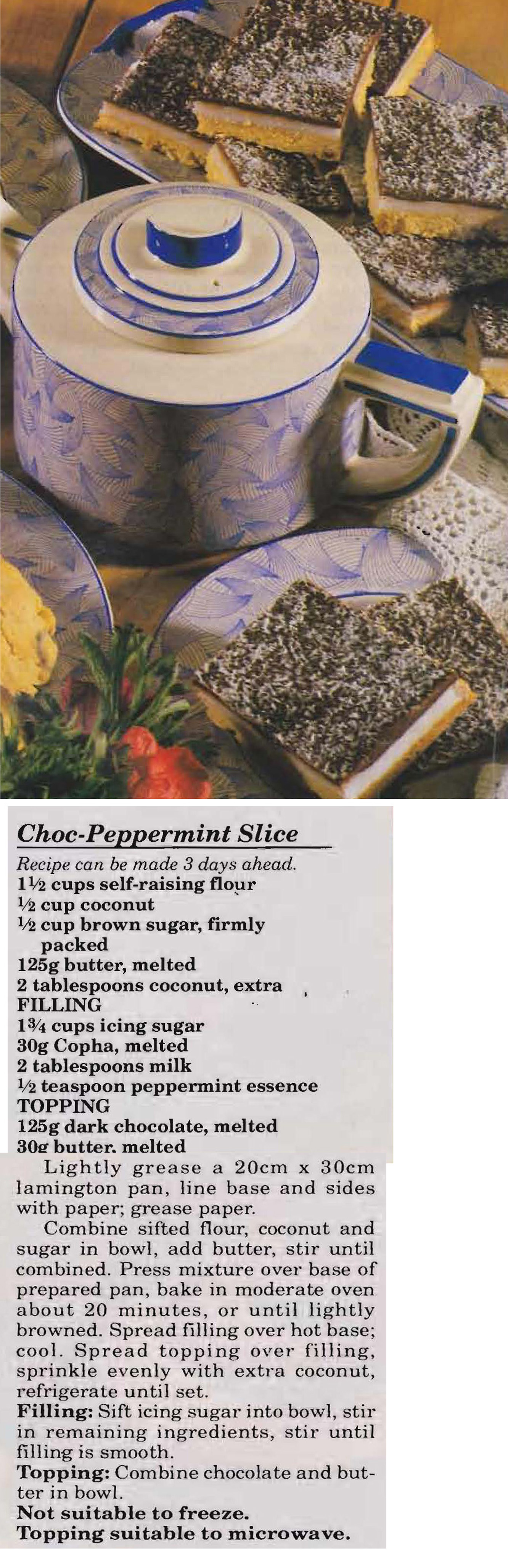 You can tell this is an old fashioned slice because of the copha in the filling. Copha was used a lot back in the 70s and 80s, but seems to have gone out of favour these days. Not everyone likes the taste, but in this slice, at least, the peppermint, chocolate and coconut mask it and you end up with a great slice.