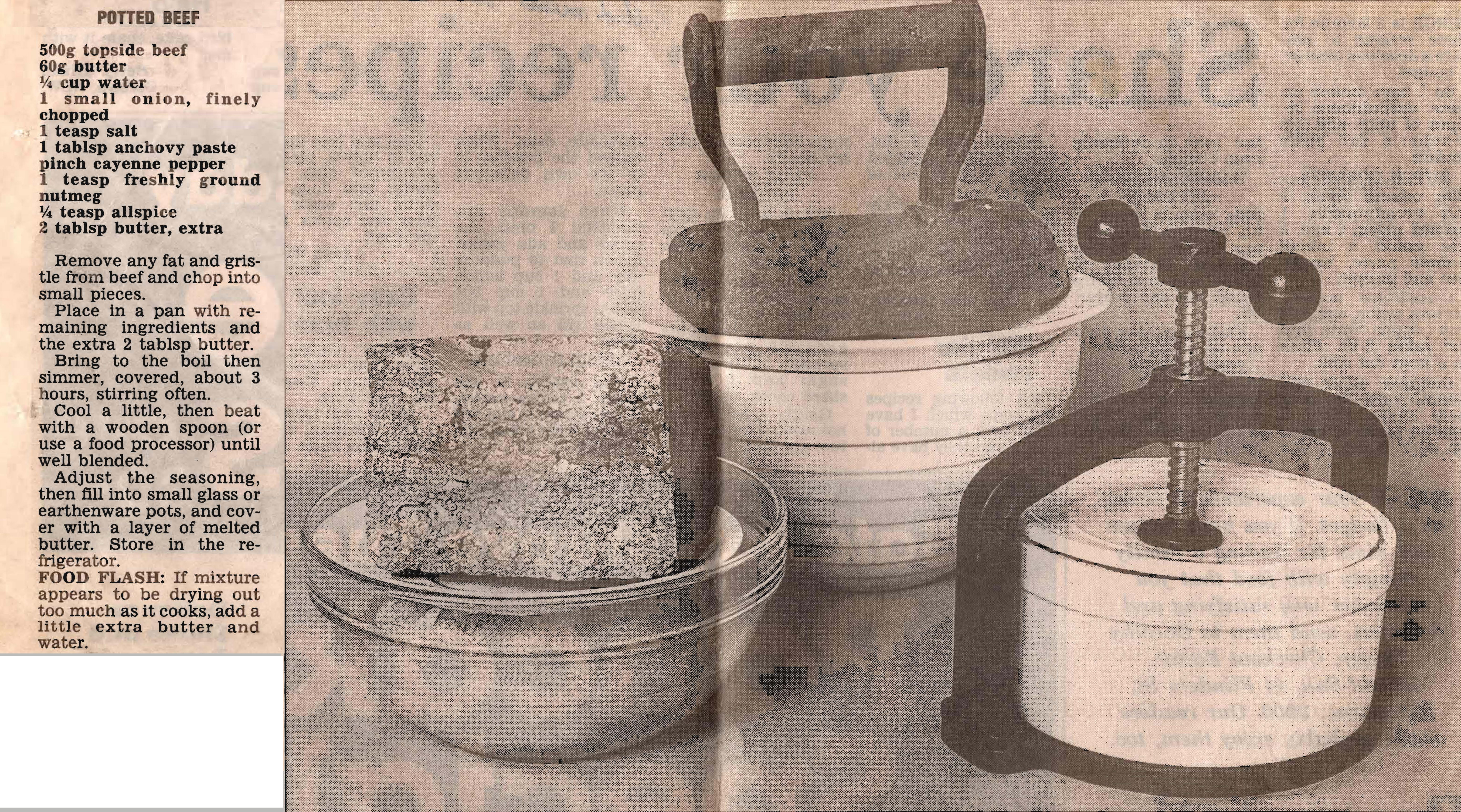 When I found this ‘Meat to press, pot and roll’ article Mum had kept from the Herald Sun in 1993 it reminded me that buried at the back of one of my kitchen cupboards is an old meat press of hers. She used it make it make various potted and pressed meats, which I confess I thought were the same thing until I read this definition.