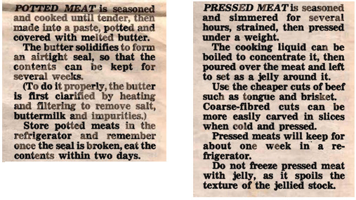 Mum mainly made pressed meats, usually tongue or beef. The article has this recipe for Potted Beef and Potted Ham and also one for Pressed Tongue. I never liked Pressed Tongue and I have never wanted to make it and doubt that anyone else does either these days so I’ve left it out, but the Beef and Ham recipes sound good. The article also shows alternatives to using a meat press. I’ve used the bowl, plate and brick method and it works really well, guess that’s why Mum’s press is still at the back of the cupboard.