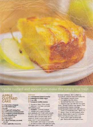 I think the words – apple, custard, cake – says it all for this recipe and when you add in apricot jam and perhaps a blob of cream, who needs more………..delicious.