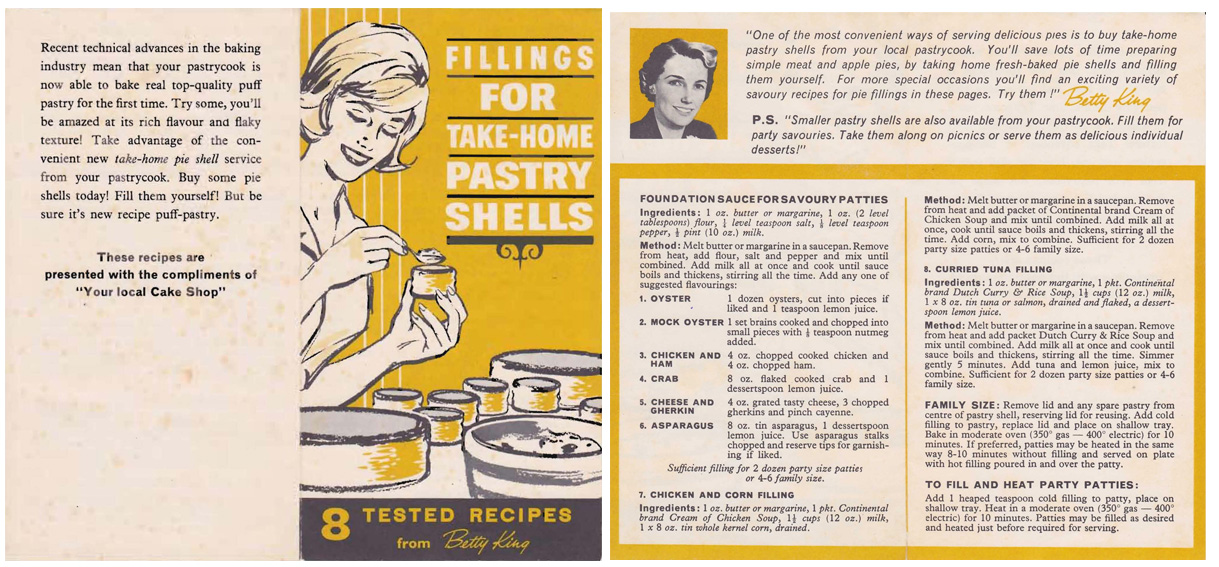 I’ve just found this wonderful leaflet entitled “Fillings for Take-Home Pastry Shells” 8 Tested Recipes from Betty King. I think it’s probably from the the late 1950s, it’s definitely from before metrics started in 1966. On checking I’ve found out that unlike Margaret Fulton, the 1970s cooking queen, Betty King did not exist. She was just an entity created as a marketing tool….an attempt to fool all of the people all of the time….so nothing’s changed there. But tastes have changed since then so I’m not sure you’d want to actually make any of the fillings.
