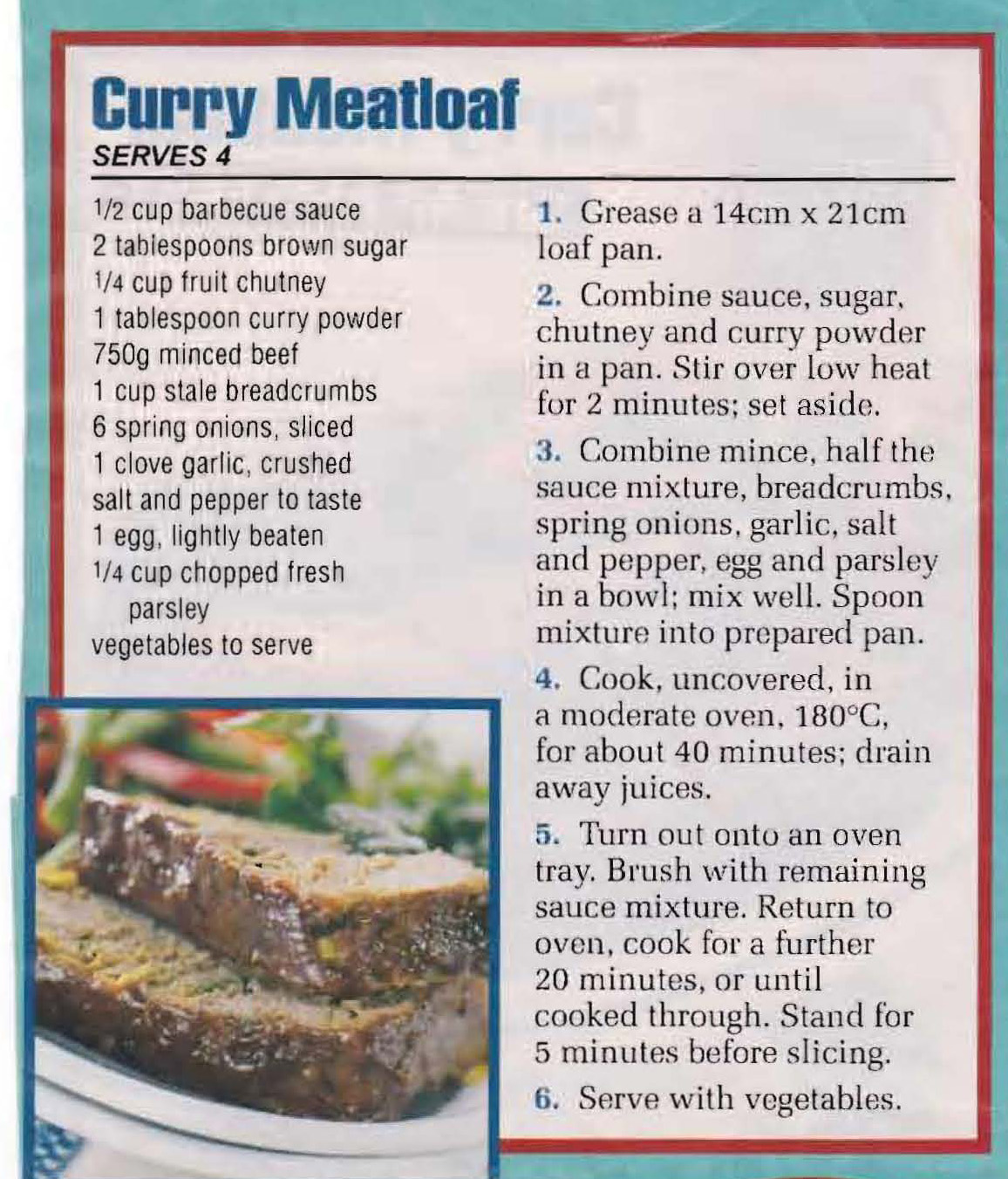 This meatloaf is a bit of a change from the standard mince steak/sausage meat combination. It has a sweet curry flavour which makes it just that bit different and it’s good hot or cold.