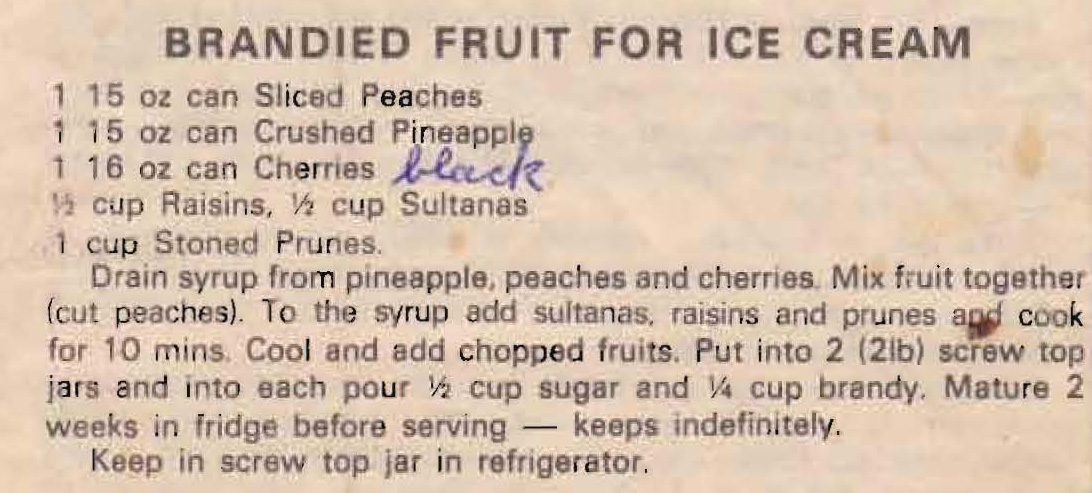 For quite a few years this was one of Mum’s favourite dessert recipes, probably because Dad liked it on his nightly bowl of ice cream. Everytime I looked in their fridge there seemed to be a jar there marinating. I think with the addition of a few other fruits it could still be good today.