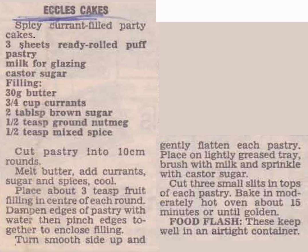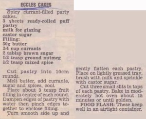 All I’ve ever known about Eccles cakes is that they are English. So when I found this recipe I thought I’d better find out a bit more about them. Good old Wikipedia tells me that ‘Eccles cakes are named after the English town of Eccles. It is not known who invented the recipe, but James Birch is credited with being the first person to sell Eccles cakes commercially, from his shop in the town centre in 1793″. Any fans of the 1950s Goon Show will also know that Eccles was a character played by Spike Milligan – an amiable, well-meaning man with no wits or understanding, in other words a bit of an idiot. So the humble Eccles Cake has quite a history.