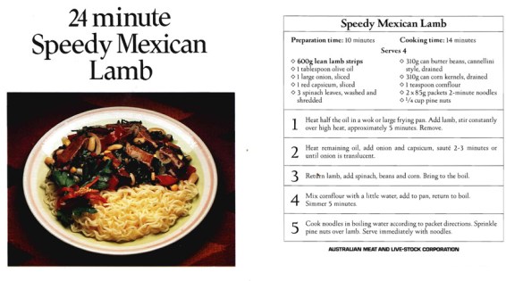 As you can see the full title of this recipe from the Australian Meat and Live-Stock Corporation is ’24 minute Speedy Mexican Lamb’, a bit long I thought so I’ve shortened it. The good thing is that it’s quick to make. I think the recipe card was put out by the Corporation in the late 1980s, whenever it was, Mum and I both seem to have collected quite a few from our butchers’ counters.