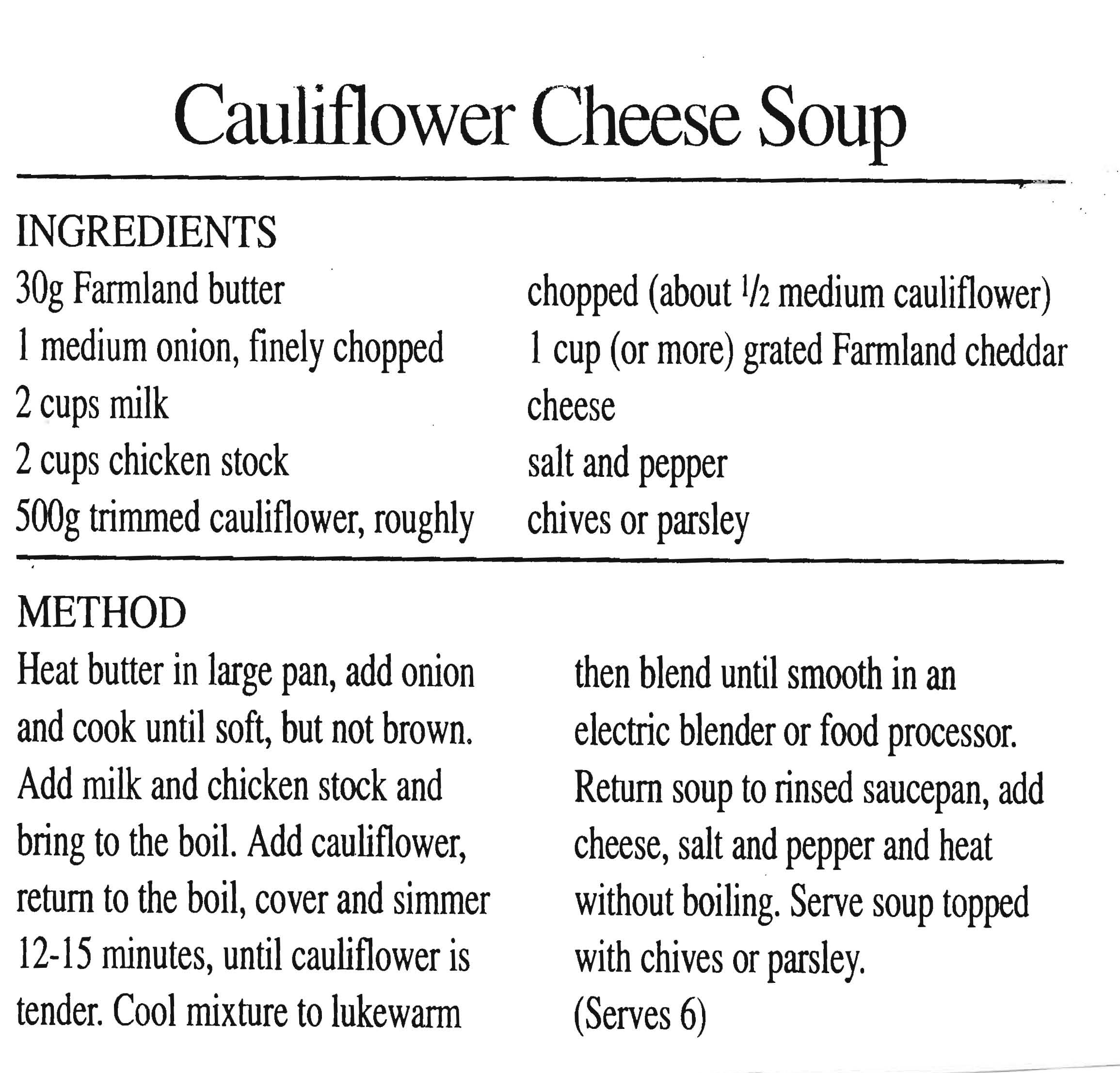 Another soup to warm you in these cold winter months. This one is a rich, creamy, cheesy, cauliflower combo. Served with a dab of cream and the chives or parsley on top I think it would be good enough for a dinner party.