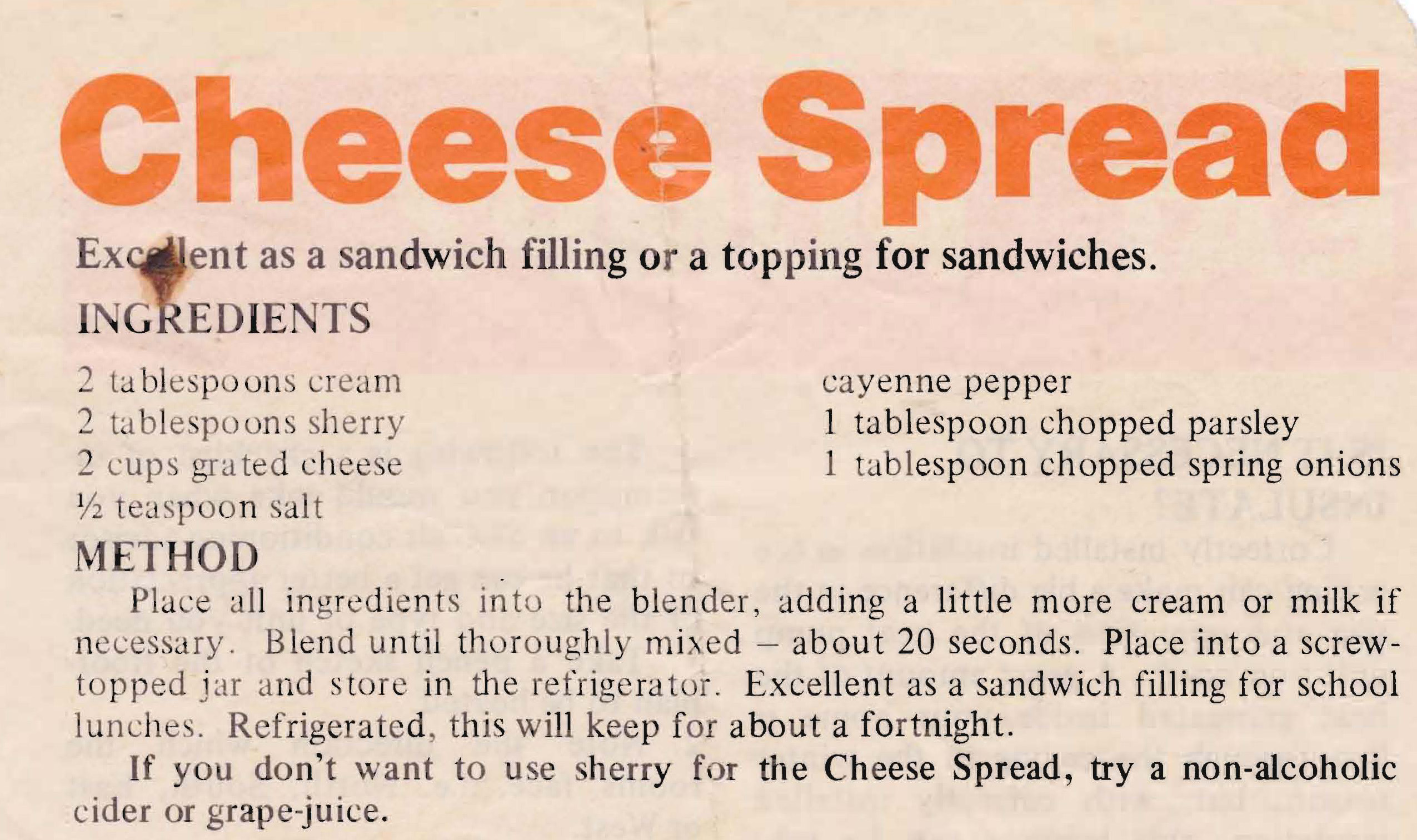 Every time I pick my granddaughters up from school and take their lunch boxes out their school bags I’m astonished at how magnificent lunchboxes are these days. When I was at school my lunch was a sandwich wrapped in lunch wrap and piece of fruit which Mum into a brown paper bag. Unsurprisingly squashed sandwiches and squashed fruit were often the result. Mum was also inventive with sandwich fillings, banana and sultanas, vegemite and celery, cheese and beetroot and sometimes a homemade cheese spread. Not sure that this is the recipe she used as she wouldn’t have put sherry in her kids sandwiches, but it might be tasty for bigger kids lunches at work or uni or as a dip.