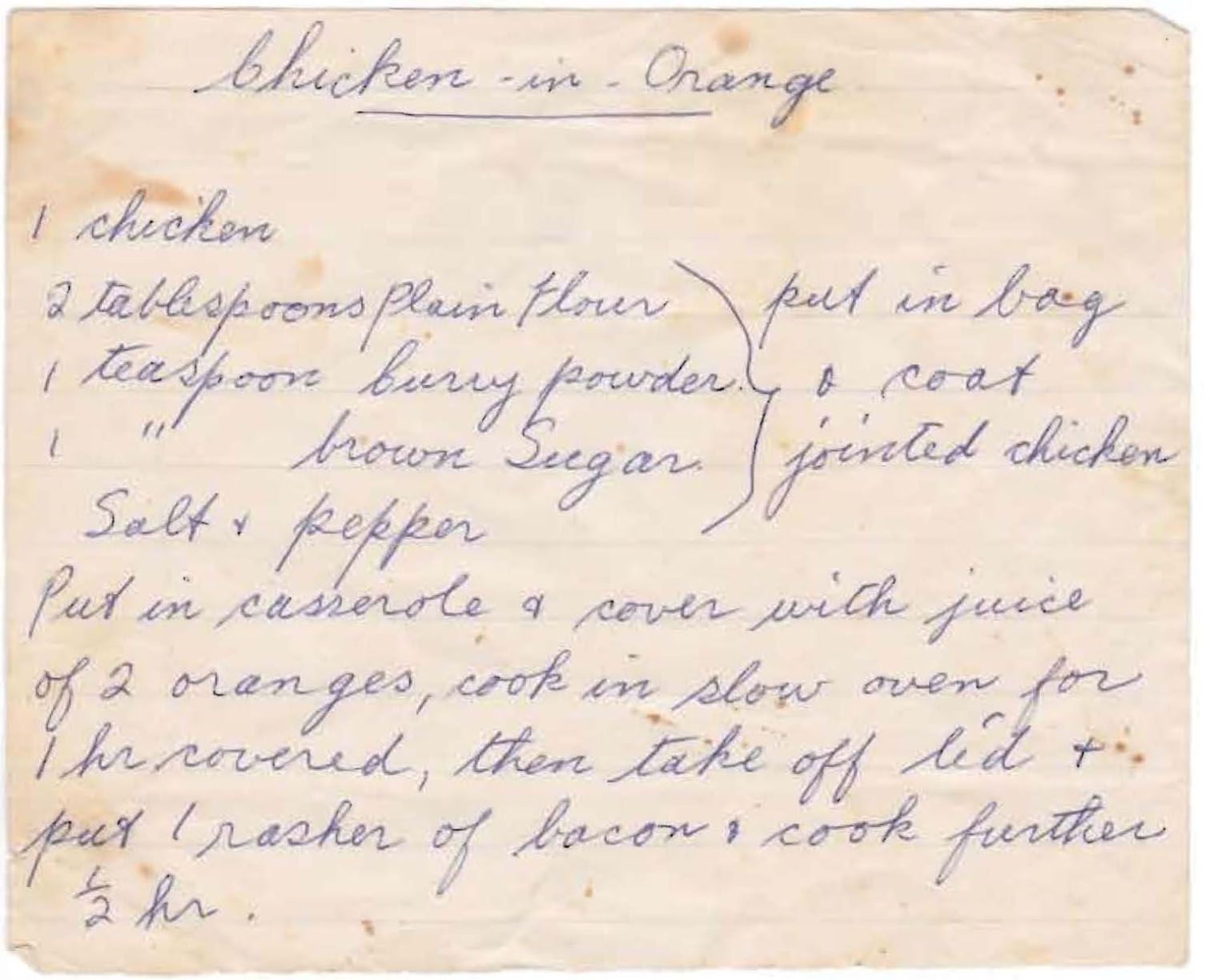 Put in a casserole and cover with the juice of 2 oranges. Cook in a 170º oven for 1 hour covered. Then take off lid and put 1 rasher of bacon on top. Cook a further ½ hour.