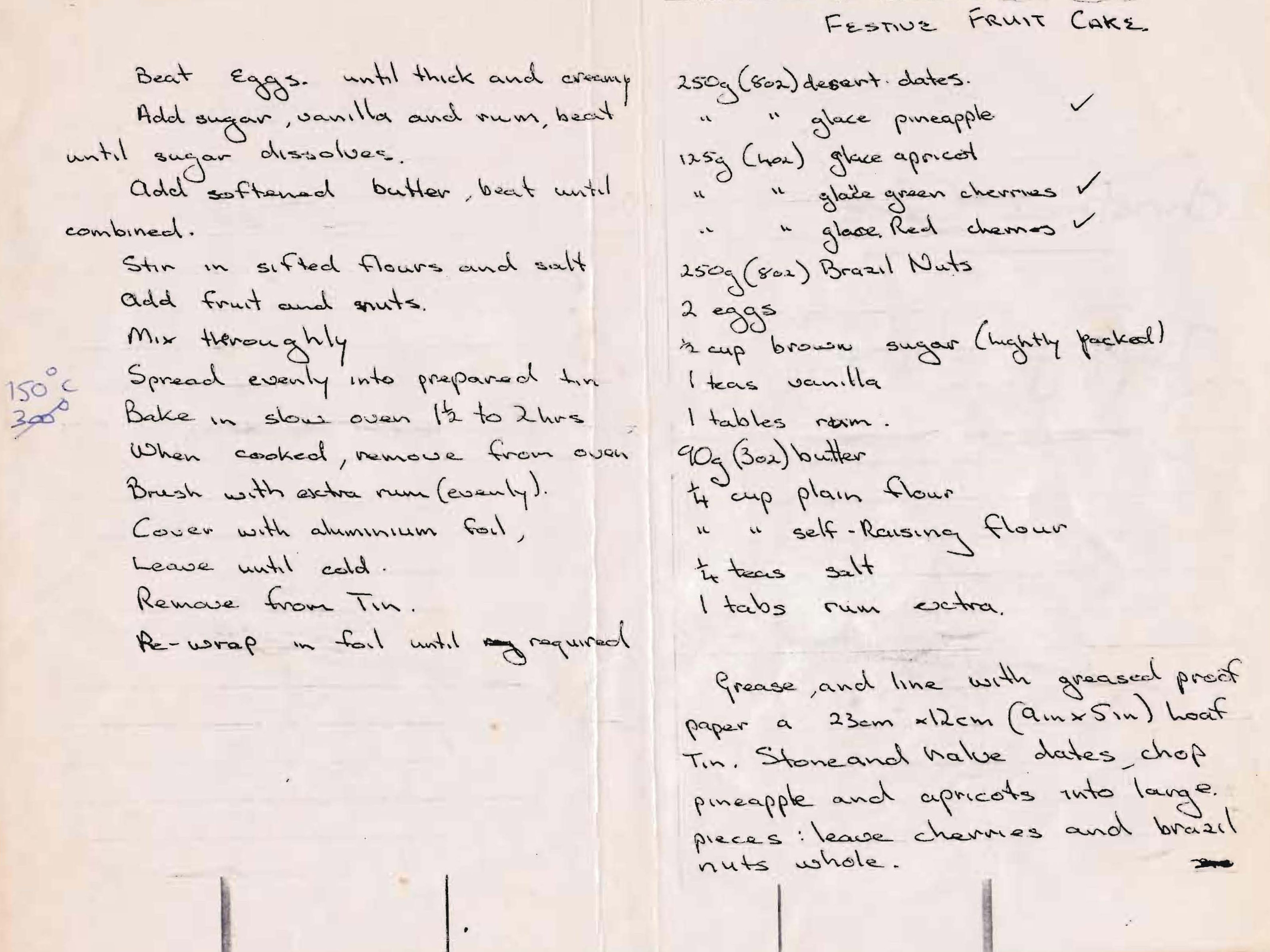 This is the recipe I usually use to make my Christmas Cake. Back in 2001 I doubled the recipe to make a two tiered cake for Mum and Dad’s 60th Wedding Anniversary, which I had decorated in the 1940s style of their wedding, it looked and tasted great. The recipe came to me from a friend who made it as a Wedding Cake for her daughter. As you can see it was passed onto her from her friend ‘Audrey’ so it has quite a history. I always add the extra prunes and apricots and it makes a lovely cake that lasts as long as you can keep the family away from it.