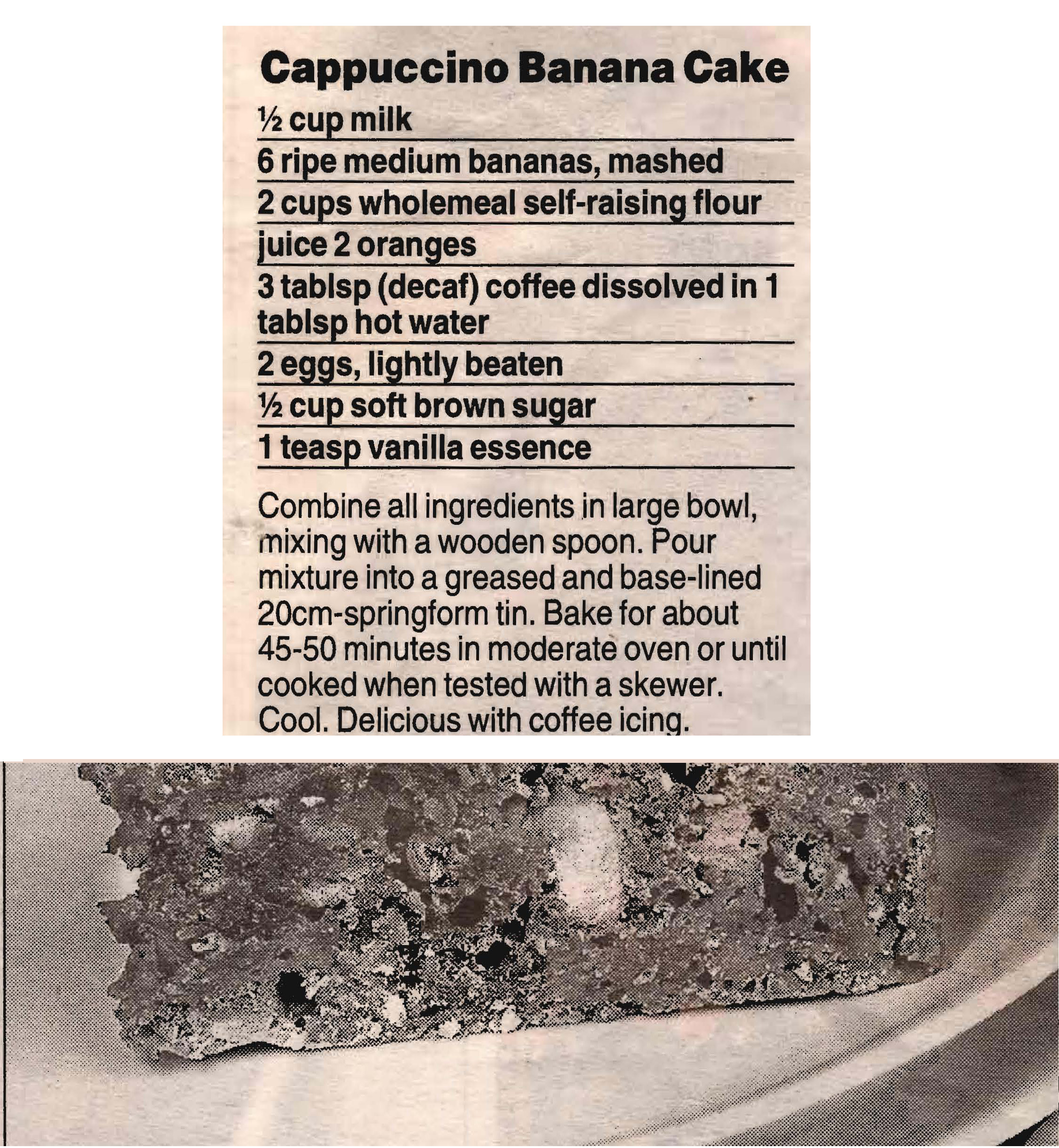 My apologies for the picture with this recipe, Mum cut the picture in half so it’s the best I could do. I thought it worth putting in to show the texture of the cake – the banana is quite chunky. That together with the wholemeal flour and coffee makes it quite a different banana cake.