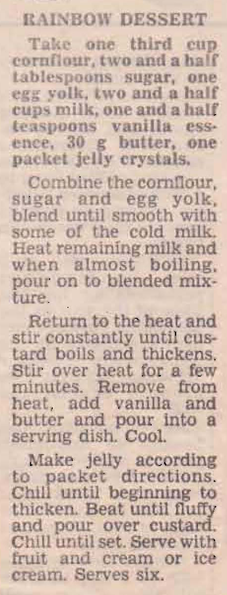 At one stage Mum used to make quite a few desserts that were topped with beaten jelly. It works really well on top of a trifle or with berries mixed in. This recipe is really just a fancy was of combining custard and jelly that you then serve with fruit and cream or ice cream. Should be one the kids would like.