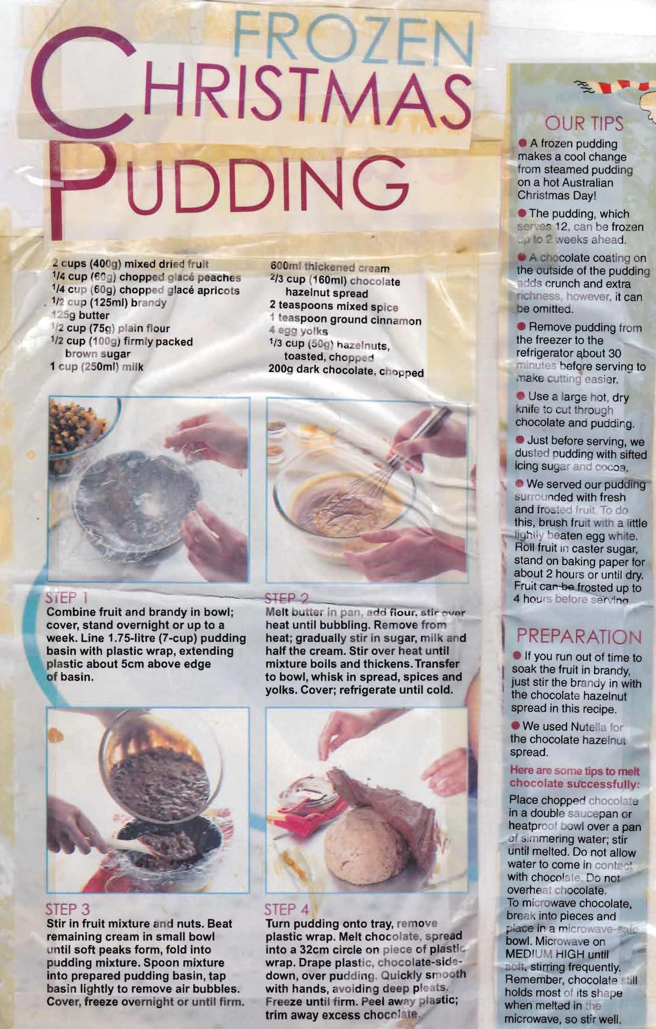 The frozen Christmas pudding I usually make has an ice cream base. This one is a little bit different, it still has decadent brandy soaked fruit, but also has lashings of cream, some white chocolate and meringue. I’ve already made a boiled pudding for this year, but think I might give this one a go next year.