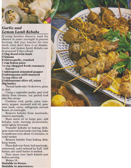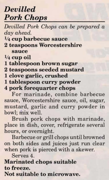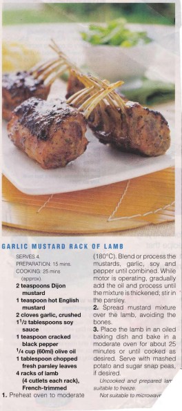 Lamb is such a versatile meat. You can roast it, casserole it, grill and bbq it, whatever you have the time or the taste for. The page of lamb recipes that Mum kept from July 1997 showcases this versatility. This recipe give a basic lamb chop a real lift and makes a change from just eating it with tomato sauce.