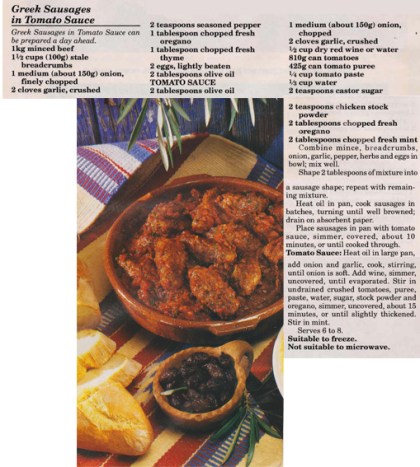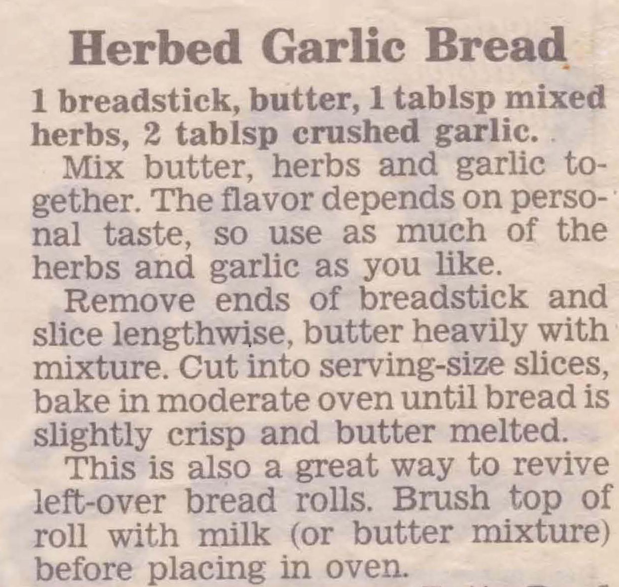 I’m lazy these days and buy prepared herb or garlic bread at the supermarket, but back in the 1970s you had to make your own. This recipe is slightly different because it has both the garlic and herbs in the one loaf. It says to slice the breadstick lengthwise, butter it and then cut into serving size pieces, again not what we usually did. Think I’d stick to just cutting it into serving size pieces and definitely wrap it in foil before you put it in the oven otherwise you’ll have butter everywhere.
