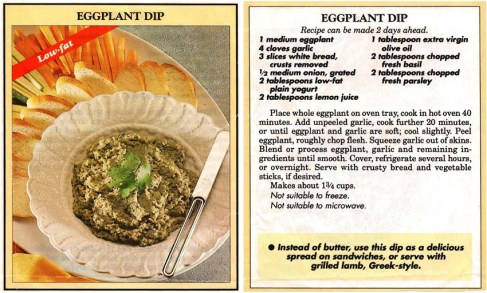 Eggplant Dip or Baba Ganoush is a fairly easy dip to make and as this recipe can be made two days ahead and is vegetarian, it has a lot going for it. The gluten content wasn’t something we considered back in the 80s when this recipe was printed, and slices of bread have been used to thicken it. If that’s a problem for you, you could substitute GF tahini for the bread.