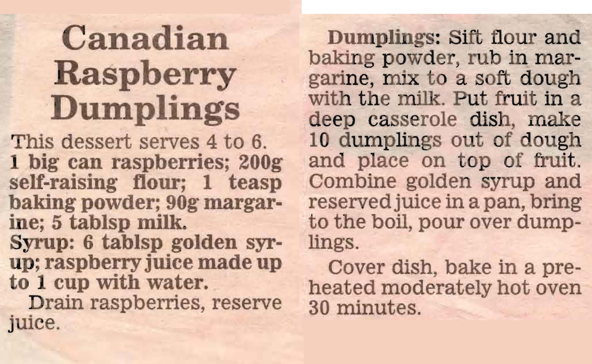 Golden syrup dumplings have always been a family favourite, served up with a dollop cream or ice cream they’re delicious. This is the first time though I’ve seen a recipe for raspberry dumplings. Despite the name on the recipe I’m not sure they’re native to Canada!! Of course, you can use fresh raspberries, just gently cook them with some sugar, water and butter, drain them and reserve the juice to mix with the golden syrup.